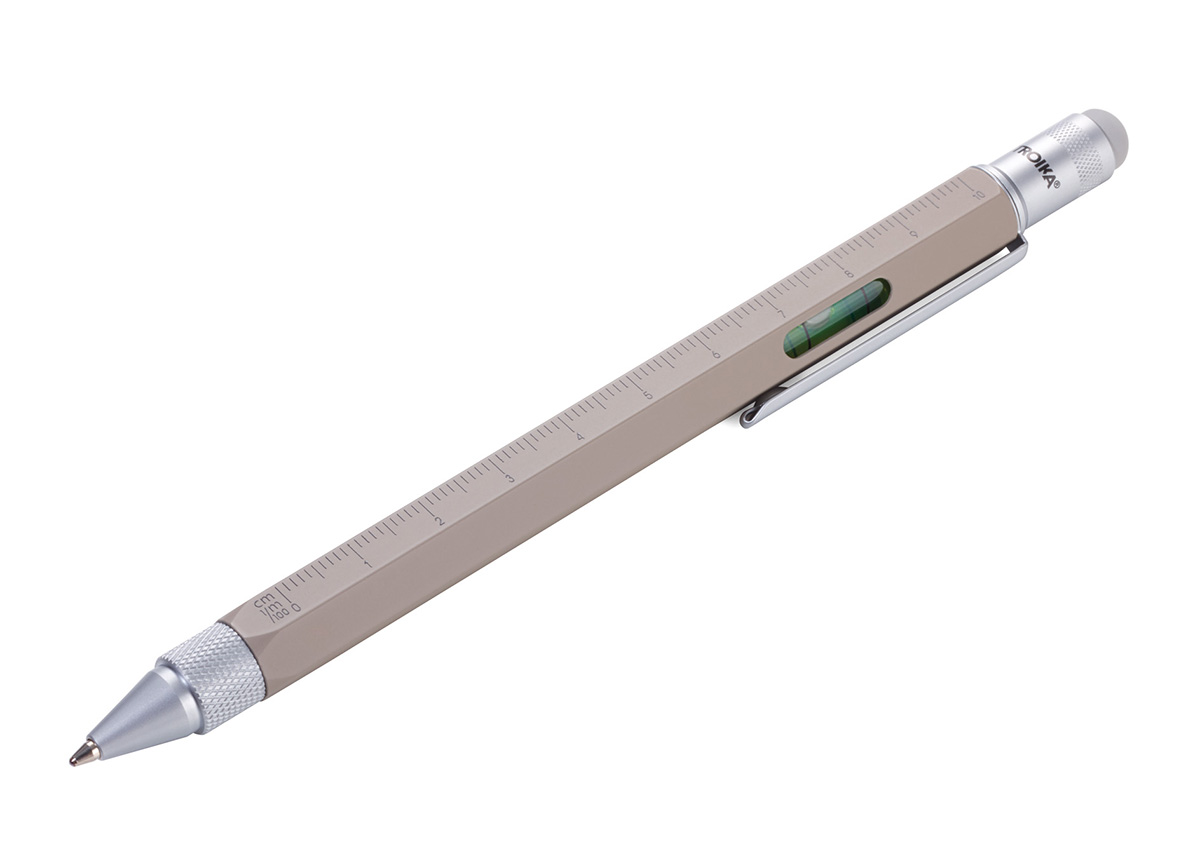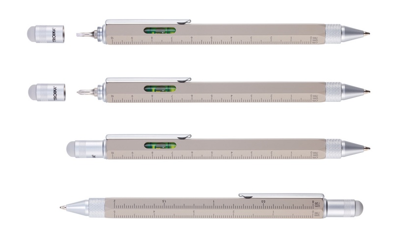 • Ten innowacyjny długopis mieści wszystko, czego w danym momencie potrzebujesz: linijka 10 cm i 4 cale, skalę 1:20 i 1:50, poziomicę, śrubokręt płaski i krzyżakowy oraz rysik do ekranów dotykowych.
