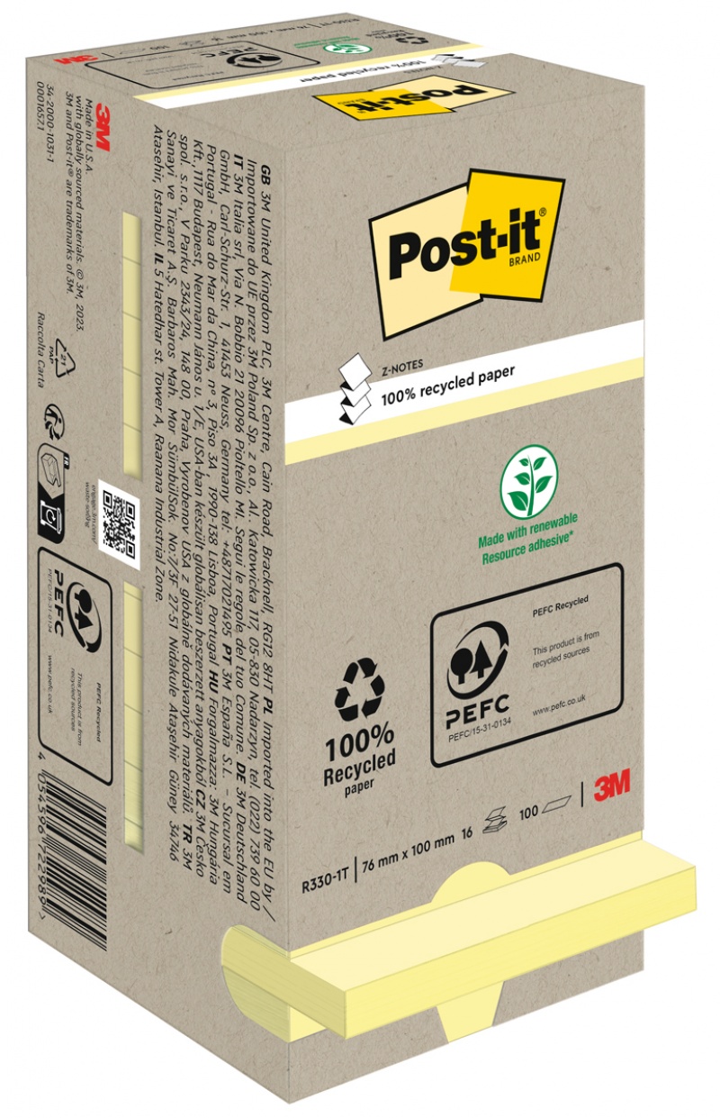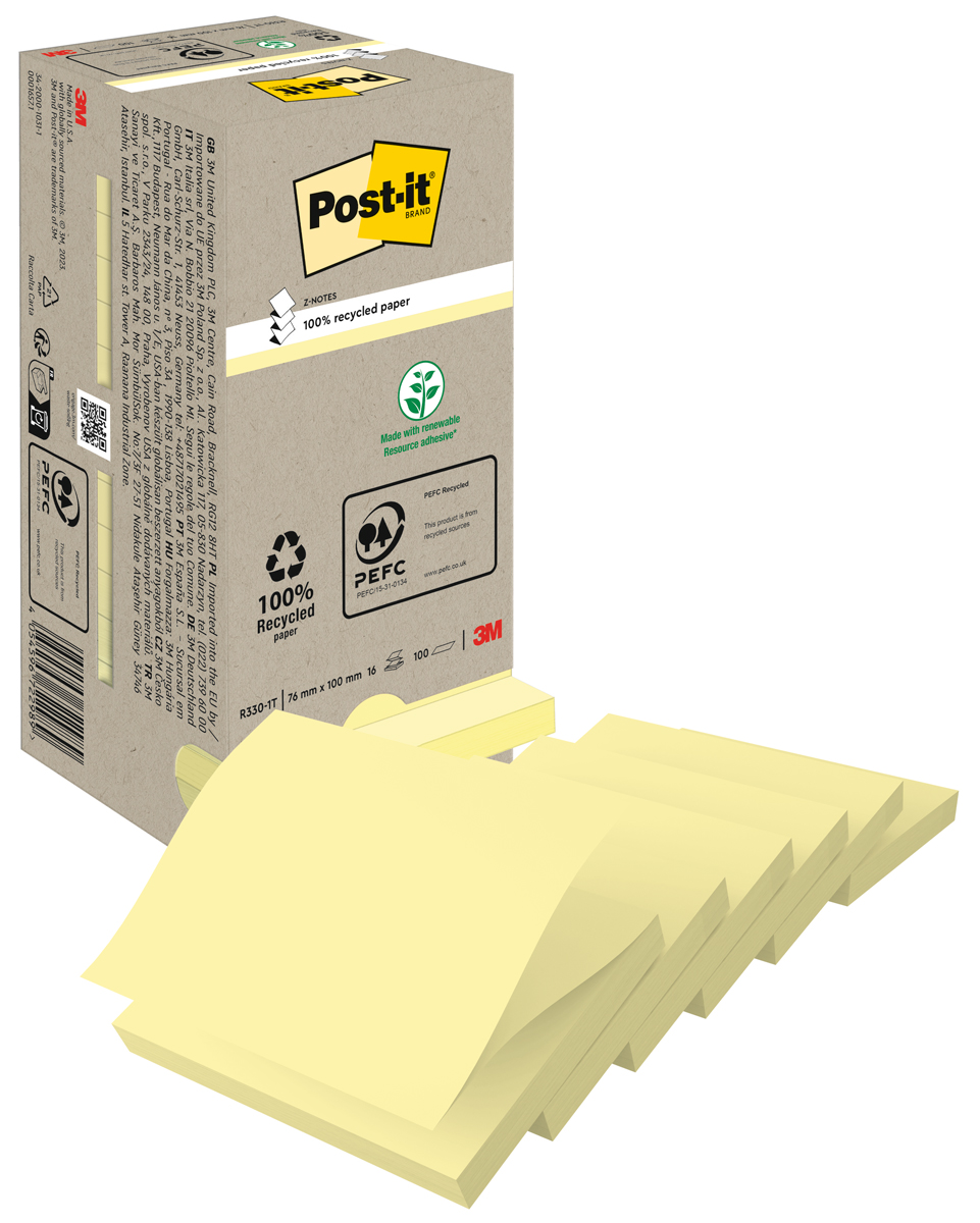 Karteczki samoprzylepne POST-IT® Recycled Z-Notes (R330-1T), 76x76mm, 16x100 kart., żółty